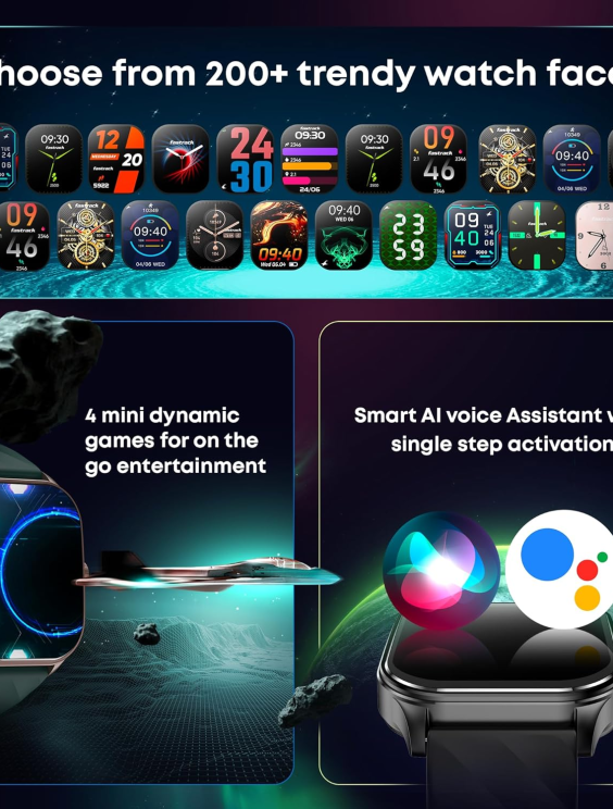 • Advanced 110+ Sports Modes, 200+ Watchfaces, In-Built Games, AI Voice Assistant and many more handy features at a single tap; Health Monitoring with Auto Stress monitor, 24×7 Heart Rate, Sleep Tracker, Spo2 and Women’s Health