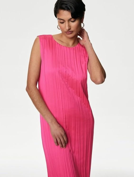 - A distinctive plisse finish adds texture to this sleeveless column dress from our Autograph collection. It’s cut to a regular fit, with a straight, body-skimming shape. The simple round neckline curves into a subtle button and zip fastening at the back. Piped trims at the neck and armholes add a neat finish. A full lining ensures that the dress is comfortable to wear. Autograph: premium investment pieces featuring contemporary cuts and refined finishing touches.